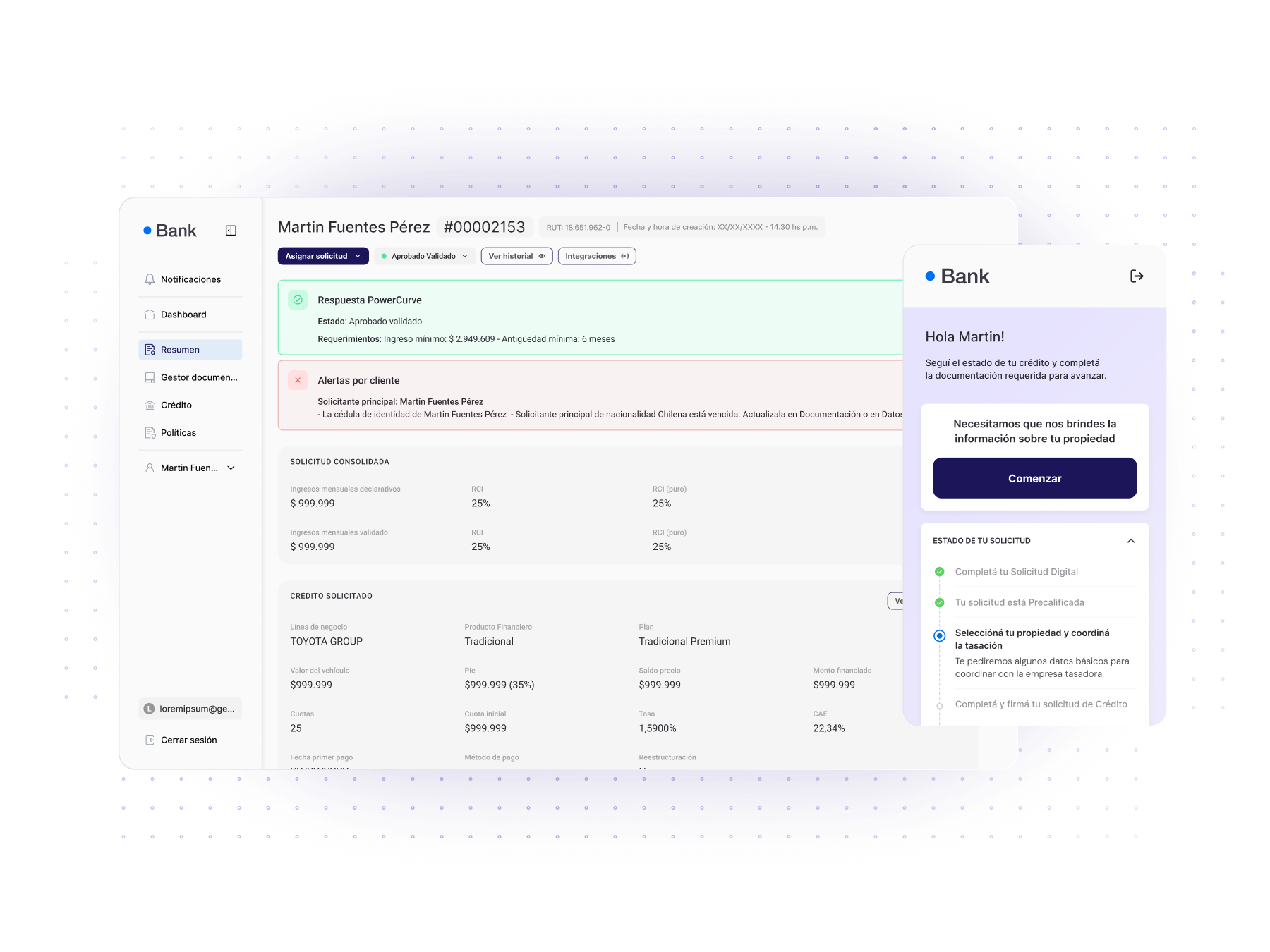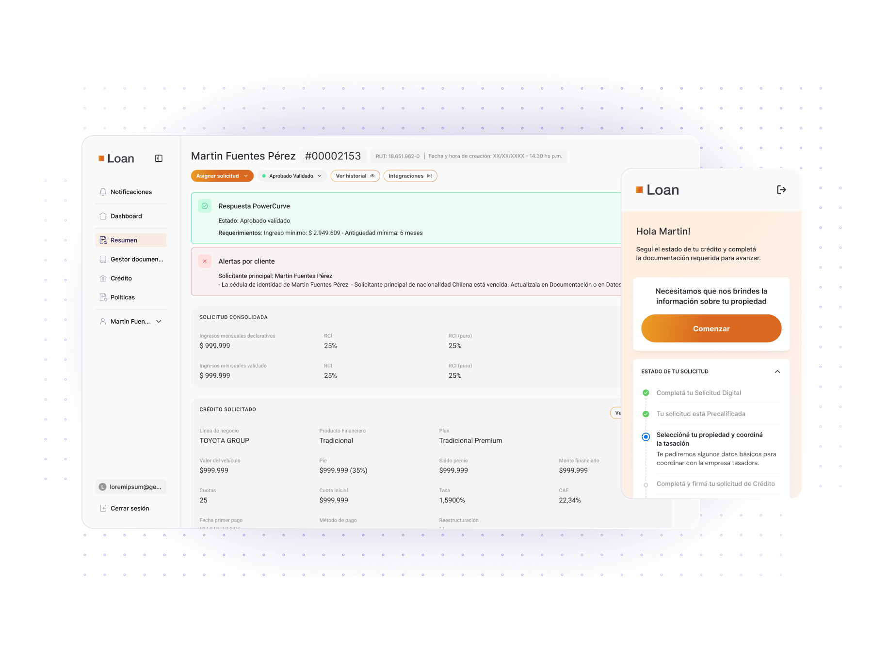 Centraliza la originación en una plataforma que conecta clientes, ejecutivos y vendors —tasadores, abogados y registros— en procesos digitales y trazables.